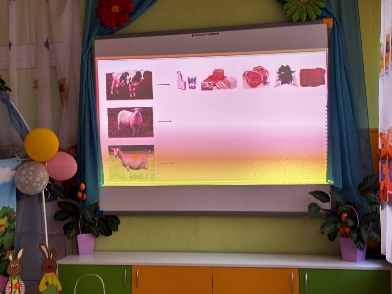 - Продължихме с интерактивна презентация, в която разгледахме различни домашни животни и открихме какви храни получаваме от тях. Децата активно участваха и споделяха своите любими животни!