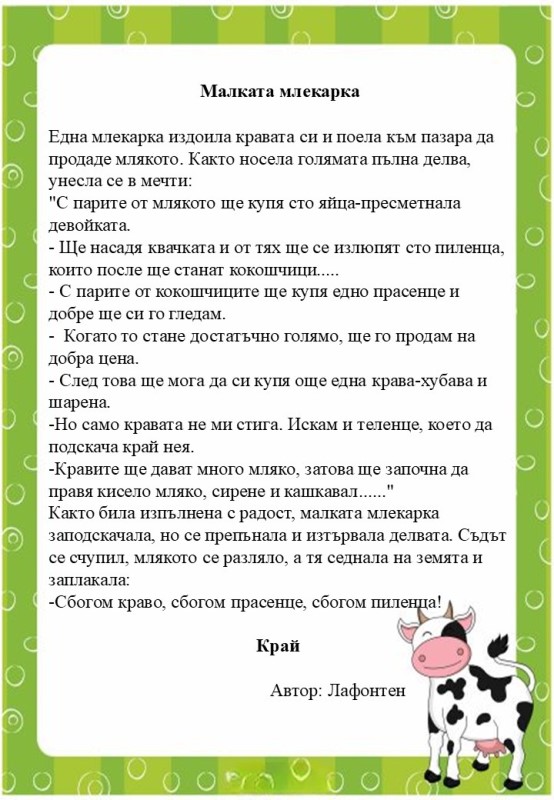 - Започнахме с четене на приказката „Малката млекарка“, запалвайки въображението им и провокирайки интереса към литературата, а също така и каква е поуката от приказката.