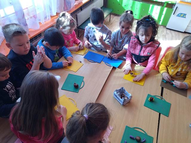 Децата от група" Брезичка ", с голямо желание използваха характерните за сезона есен - кестени и пластилин за творчество. С тях в началото на месец октомври 2022 година  малките творци изработиха охлювче.