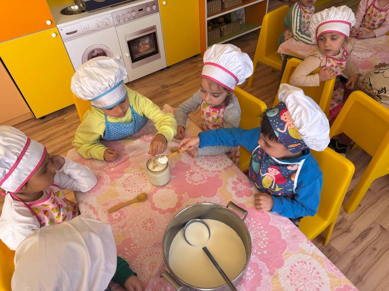 Учихме за плодовете и зеленчуците, техните цветове и ползи за здравето. Наблюдавахме как готвачките в кухнята приготвят вкусна и здравословна храна – с внимание, любов и грижа към децата. Разговаряхме за важните връзки между човека, природата и доброто здраве.